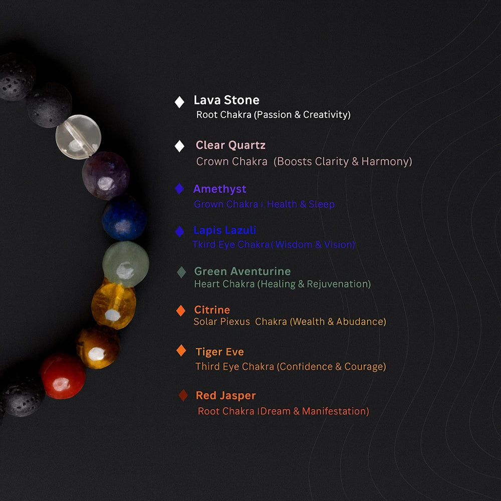 - 7 Chakra Healing - We will send a 100% original healing crystal bracelet made of seven crystals stone and lava beads with a lab certificate for healing the seven chakras or energy points of the body.